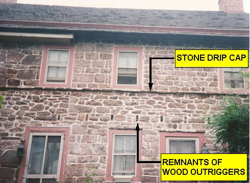 Evidence of this exists in the fact that remnants of the outriggers (sawn flush to the exterior walls when the pent roofs were removed) were found along the entire length of the south wall, incorporating the original and later additions. A drip cap also exists along the entire length of the south wall. While outriggers and a drip cap exist on the north, or rear, wall of the original section, no evidence could be found to suggest that the pent roof had been extended across the north wall of the later addition.