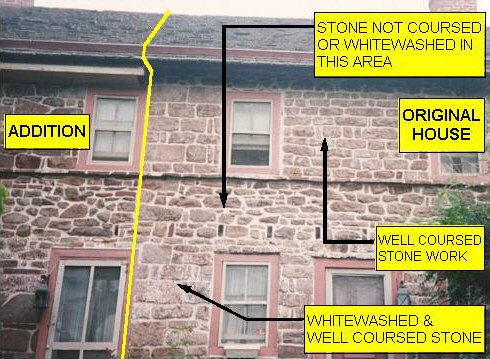 A second reason for the enclosed soffit is in the masonry. While the south wall was constructed of rather well coursed stone, the area encompassed by the pent roof was not coursed. The north, or rear, wall was perhaps not as well coursed but there was a definite difference again between what was exposed and what the pent roof would have covered. The differences in the coursing indicates that the pent roofs would have had an enclosed soffit thus hiding the uncoursed masonry from sight. Lastly, an enclosed soffit was desirable from a maintenance point of view. An open soffit would certainly provide suitable living quarters for birds, bees, etc. and cause continual maintenance problems. An enclosed soffit would prevent the pent roofs from becoming an attractive nesting place.