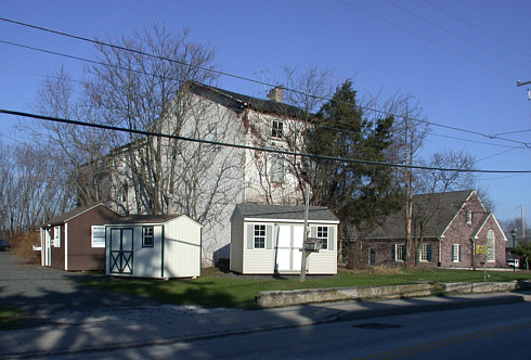 This is a photo of what remains today (12/2003) of the Reiff Farmstead. This is a view from across Skippack Pike (Rt. 73) with the Harleysville National Bank just beyond the house. The scrub trees and wood sheds block a good view of the house.