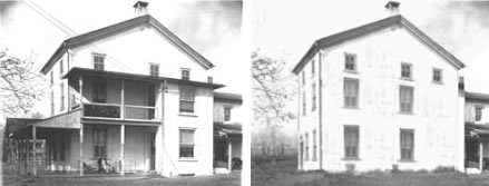 This is a view of the front of the house (along Skippack Pike) after some of the Victorian decoration and railings had been removed. The original house was probably built around 1827 and would not have included the front or side porches. You can see a little of the barn behind and to the right of the house.